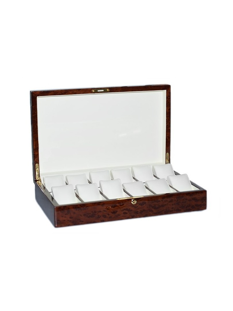 Wood watch box, 12 removable emplacement, white leather lined, key lock. Dimensions: cm. 36x22x8