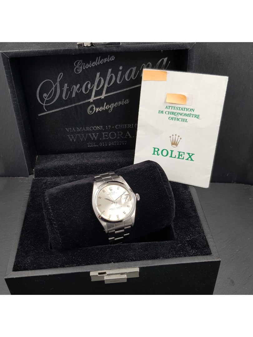 Watch produced in the years '70; steel oyster case; steel bezel; plastic glass with magnifying lens on the date at 3 o'clock; silver dial; oyster bracelet with steel rivets; mechanical self-winding movement with chronometer certification, caliber 1570; case dimensions: diameter 34 mm, thickness 13 mm; NOT waterproof; complete with original first sale warranty dated 11/1970; just overhauled in our laboratory with 1 year warranty from www.eora.it by Stroppiana