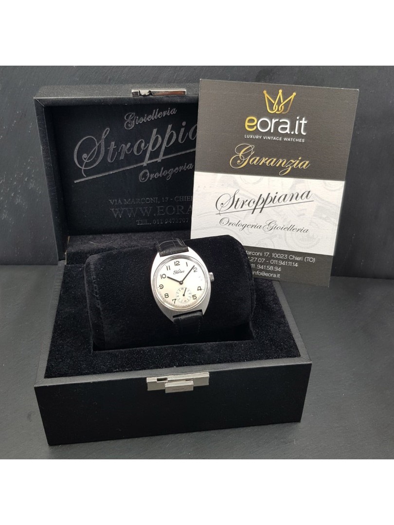 Orologi prodotto negli anni '70, adottato dalle Ferrovie dello Stato Italiano; cassa in acciaio; vetro plastica; quadrante argentè numeri arabi; fibbia originale; dimensioni di cassa: diametro 35 mm, spessore 11 mm; movimento meccanico a ricarica manuale; appena revisionato nel nostro laboratorio con garanzia 1 anno di www.eora.it by Stroppiana
