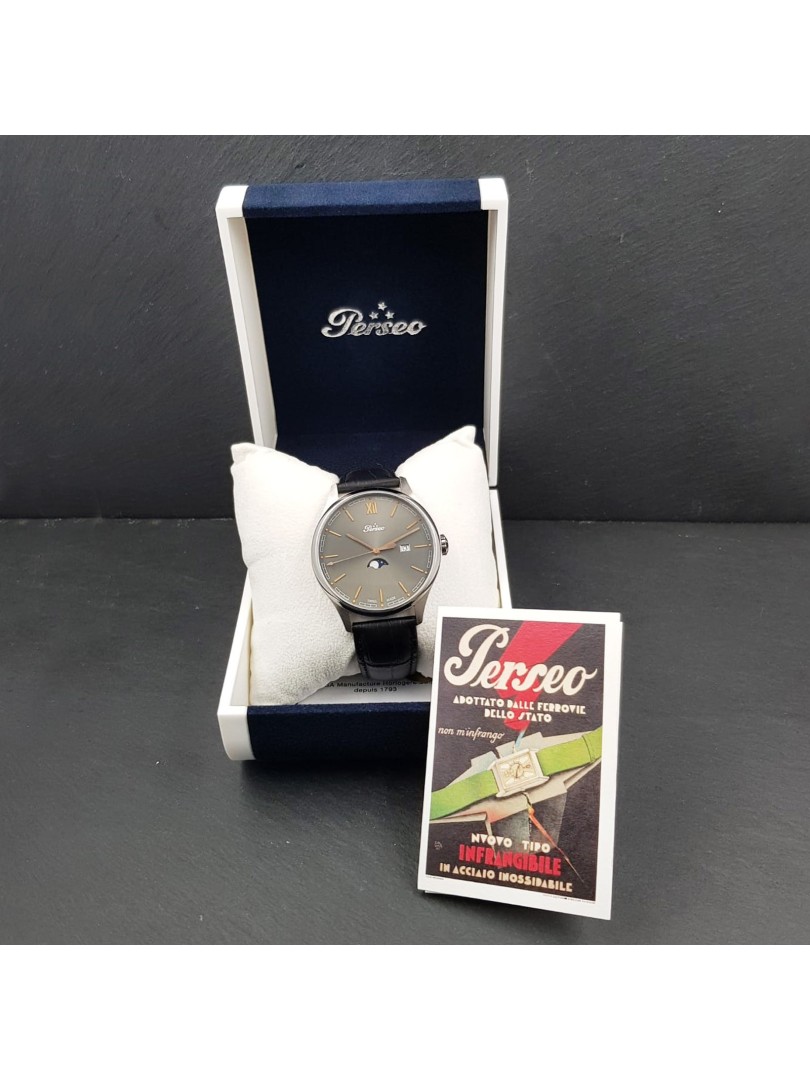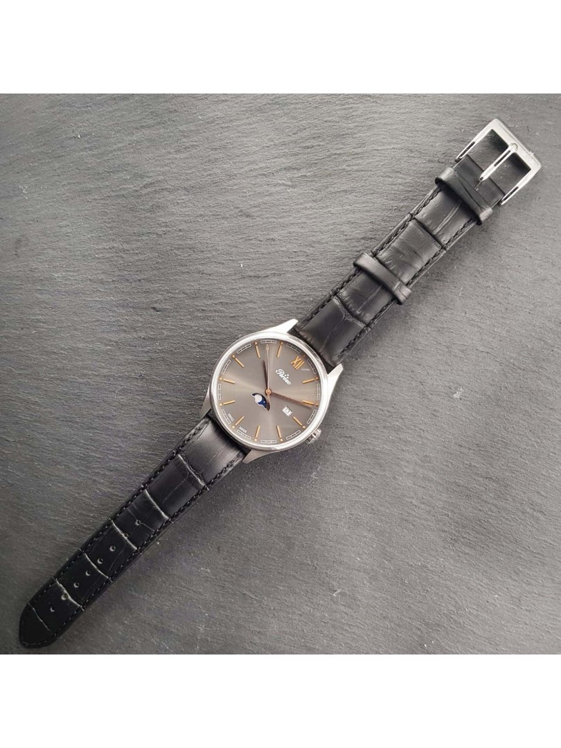 Orologio NUOVO; cassa e lunetta in acciaio; vetro minerale; quadrante grigio con indicatore delle fasi lunari al centro, datario ad ore 3; cinturino pelle e fibbia originali; dimensioni di cassa: diametro 41 mm, spessore 10 mm; impermeabile 50 mt; movimento al quarzo, calibro ETA F05.841; corredato di scatola e garanzia originale di prima vendita della durata di 2 anni.