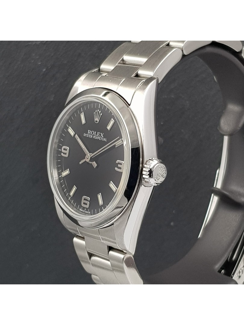 Orologio prodotto negli anni '90; cassa oyster in acciaio; lunetta in acciaio; vetro zaffiro; quadrante nero con numeri arabi (3-6-9); bracciale oyster in acciaio; movimento meccanico a carica automatica, calibro 2230; dimensioni di cassa: diametro 31 mm, spessore 11 mm; Impermeabile 100 mt; corredato di garanzia originale di prima vendita; appena revisionato nel nostro laboratorio con garanzia 1 anno di www.eora.it by Stroppiana